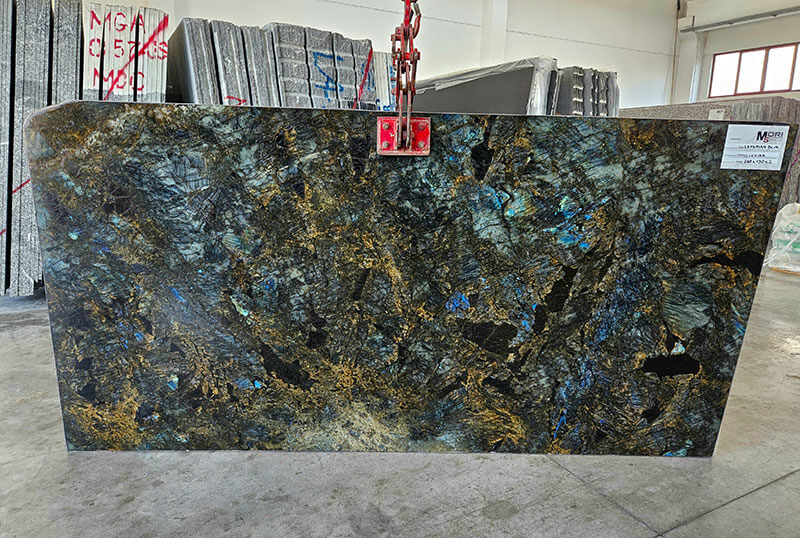 This particular type of natural stone is extracted in Madagascar and belongs to the Labradorite family. The characteristics are those of granite and it is in fact a very hard and resistant material. Its particular iridescence of the surface creates spectacular plays of light and enhances the wonderful colours ranging from green to cobalt, up to blue dotted with grey and purple.
