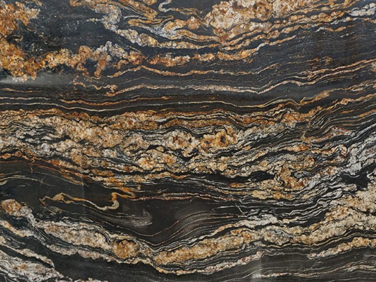 Magma Gold is a granite from Brazil. It is very striking and has a character capable of exciting the most distracted observer. Thanks to its black background dotted with swirls and golden white clouds, it is ideal for giving strength and energy to any environment: perfect for wall coverings, floorings, stairs and ornamental elements, kitchens, tops and bathrooms. Its resistance, typical of magmatic rocks, also makes it suitable for external uses.