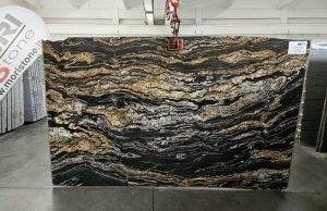 Magma Gold is a granite from Brazil. It is very striking and has a character capable of exciting the most distracted observer. Thanks to its black background dotted with swirls and golden white clouds, it is ideal for giving strength and energy to any environment: perfect for wall coverings, floorings, stairs and ornamental elements, kitchens, tops and bathrooms. Its resistance, typical of magmatic rocks, also makes it suitable for external uses.